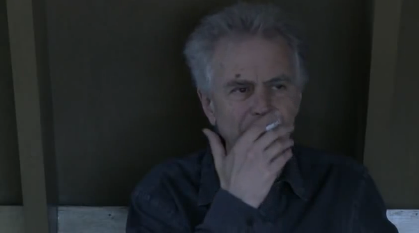 Thom Andersen é um dos… cigarros? Não, uma das pessoas, entre amigos mais ou menos conhecidos, que James Benning resolve filmar enquanto cada uma, no seu tempo ou ritmo próprio, fuma um cigarro. James Benning filma Andersen, mas também o fuma, isto é, também inala dele, da sua presença, dos seus gestos mínimos no sentido da degustação lenta do vício, uma importante “peça de cinema contemplativo”. O cigarro é estrutural em Twenty Cigarettes (2011). Portanto, é aí, no espelho Benning-Andersen, que se atinge a culminação deste exercício. Aqui, são-nos dados a ver os limites temporais de cada quadro – tamanho do cigarro e a sua forma rectilínea como timeline analógica – e rapidamente nos apercebemos que o seu esgotamento está nas mãos do objecto filmado – o fumador que pode ser mais ou menos ávido, mais ou menos contemplativo… Repito: ele, o fumador, fuma o filme verdadeiramente. O cigarro é a sua “máquina” de cinema. O cigarro é a película que queima, o cigarro é analógico… a câmara, essa, filma em digital aqui, zeros e uns que marcam, a contra-ciclo, uma reversibilidade na imagem. Mas um cigarro não se presta a isso, porque, enfim, é sempre um cigarro e nada mais. Depois de fumado, acabou.