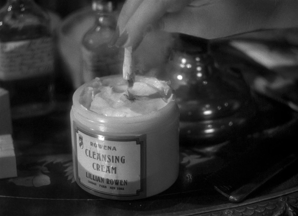 O plano é de Rebecca (1940) mas antes de começar a enaltecer o génio de Hitchcock, neste delicioso toque irónico no retrato da patroa de Joan Fontaine como uma cabra porca e vaidosa, há que dar o seu a seu dono e referir que o toque do cigarro apagado no boião do creme de beleza vem directamente da pena de Daphne du Maurier no livro homónimo cuja adaptação ao cinema dá água pela barba aos historicistas da Sétima Arte. Feita a devida ressalva não se pode esquecer também que se o motivo não é originalmente hitchcockiano também não deixa de ser verdade que Hitchcock a ele regressou noutro famoso plano de To Catch a Thief (1955) em que de novo um senhora com parentesco caprino afoga a brasa do seu fumo num ovo estrelado – e todos sabem da ovofobia do realizador britânico “I’m frightened of eggs, worse than frightened, they revolt me” – plano esse que se converteu recentemente, pelo pincel de Martín Sichetti, numa bela tela que faz parte de uma série de trabalhos do pintor em redor do universo pictórico do mestre do suspense [e também posso citar a versão de pastel de nata que António-Pedro Vasconcelos reproduziu no seu A Bela e o Paparazzo (2010)]. Mas regressemos a Rebecca, a função do plano acima não se fica apenas pela descrição de personagem, há uma leitura mais freudiana: a patroa queria engatar Olivier, este prefere as moças novas e nem sequer responde aos recados da enchouriçada senhora, ao aperceber-se da alegria da sua dama de companhia mais afortunada que ele a lady apaga o seu braseiro no creme de beleza ou, inversamente, por perceber as limitadas capacidades dos cosméticos na arte da sedução manda a pomada para as urtigas com uma fálica mortalha num fuck it all cancerígeno. Mal sabia ela do que se livrava…