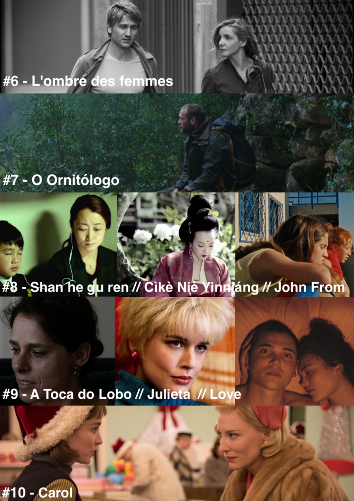 De qualquer maneira, este foi um ano sob o signo da Ásia, ainda que todos os filmes asiáticos aqui trazidos sejam de realizadores absolutamente estabelecidos no panorama do cinema internacional: o já referido Hong Sang-soo, o tailandês Apichatpong Weerasethakul, o chinês Jia Zhang-ke e o taiwanês Hou Hsiao-hsien. Por falar em nomes estabelecidos, o que dizer da aparente “ressurreição” de um nome como o de Pedro Almodóvar, ele que estava arredado destas contas há já muito tempo? Esta será uma das surpresas do top, mas a grande provocação está noutro lado: o muito amado, mas também odiado, Love de Gaspar Noé chega à lista final. Outro choque, de outro tipo, também não caiu facilmente no nosso esquecimento: Saul fia faz-nos entrar, com dureza, na realidade horrenda dos campos de concentração – e de lá nunca chegamos verdadeiramente a sair. Nota final para o último filme da lista: Carol de Todd Haynes. Um bombom sentimental, belo mas amargo, que encerra o balanço final deste ano onde a diversidade é a nota dominante.