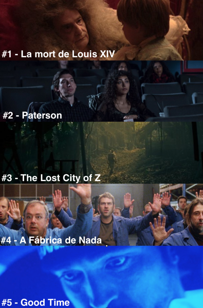 Este ano mudámos as regras do top: não houve espaço para ex aequos. Temos, portanto, pela primeira vez desde que há À pala de Walsh, exactamente dez filmes no(s) nosso(s) top(s). Este top 10 final espelha a diversidade de proveniências do grande cinema: 4 filmes norte-americanos, 4 europeus, 1 asiático e 1 sul-americano. Destes, temos de destacar, desde logo, o mais votado dos filmes deste ano: La mort de Louis XIV de Albert Serra. Esta obra, de co-produção portuguesa (pela Rosa Filmes), foi por três vezes eleita, entre os nossos walshianos, a melhor de 2017. A passagem do filme de Albert Serra não se ficou pelas salas de cinema, tendo chegado a Portugal também sob a forma de performance e exposição em galeria. Recordamos ainda que, aquando da exibição do filme anterior de Albert Serra, Història de la meva mort (História da Minha Morte, 2013), o À pala de Walsh publicou uma picante entrevista. Por falar em regressos acarinhados, Jim Jarmusch volta ao top do À pala de Walsh, depois de em 2014 ter chegado ao quarto lugar com Only Lovers Left Alive (Só os Amantes Sobrevivem, 2013). Paterson chega ao segundo lugar, mas não é o único filme norte-americano desta lista, nem tão-pouco o único repetente: James Gray, que nesse ano de 2014 ficara em segundo lugar por causa de The Immigrant (A Emigrante, 2013), coloca The Lost City of Z em terceiro lugar. Nesse filme, ganhou relevo a interpretação de Robert Pattinson.
