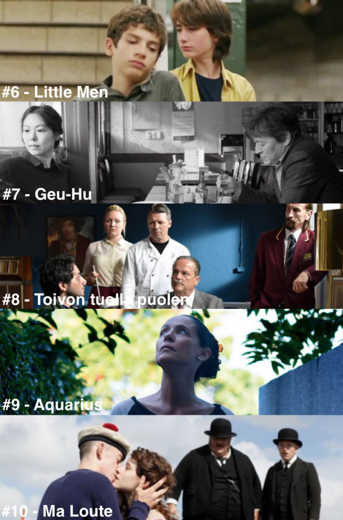 1.º La mort de Louis XIV (A Morte de Luís XIV, 2016) de Albert Serra – 56 pontos; 2.º Paterson (2016) de Jim Jarmusch – 49 pontos; 3.º The Lost City of Z (A Cidade Perdida de Z, 2017) de James Gray – 42 pontos; 4.º A Fábrica de Nada (2017) de Pedro Pinho – 41 pontos; 5.º Good Time (2017) de Benny Safdie e Joshua Safdie – 37 pontos; 6.º Little Men (Homenzinhos, 2016) de Ira Sachs – 35 pontos; 7.º Geu-Hu (O Dia Seguinte) de Hong Song-soo – 34 pontos; 8.º Toivon tuolla puolen (O Outro Lado da Esperança, 2017) de Aki Kaurismäki – 25 pontos; 9.º Aquarius (2016) de Kleber Mendonça Filho – 25 pontos; 10.º Ma Loute (2016) de Bruno Dumont – 24 pontos.