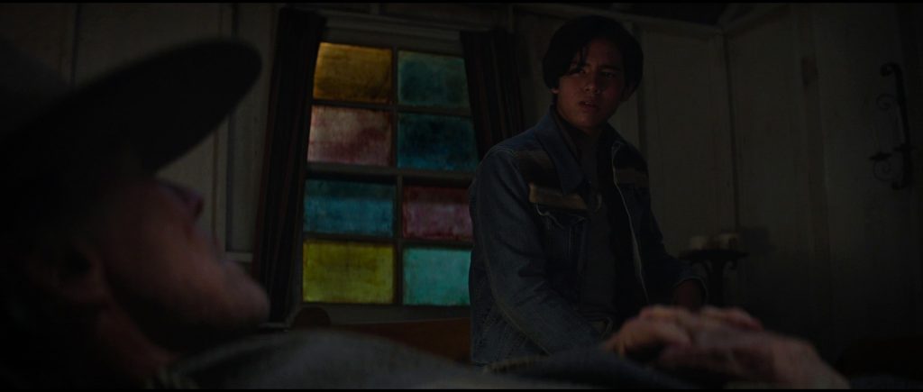 Aliado a este tempo próprio, com Cry Macho, Eastwood aplica um minimalismo que rareia por terras americanas – minimalismo não no sentido restrito de austeridade formal, mas de contenção no que é mostrado, da construção de uma narrativa através de um número mínimo de elementos: repare-se na forma breve mas de forte impacto como é abordado o passado trágico da personagem e a perda da sua família, com Eastwood deitado (numa igreja!), a esconder as lágrimas com o seu chapéu de cowboy. Quem diria que os realizadores mais próximos de Eastwood actualmente seriam mesmo Kelly Reichardt com a serenidade formal e repetições de First Cow (First Cow – A Primeira Vaca da América, 2019), o cowboy reformado de The Rider (2017) ou o olhar sobre o crepúsculo americano de Nomadland (Nomadland – Sobreviver na América, 2020) de Chloé Zhao, ou até David Lowery com o seu The Old Man & the Gun (O Cavalheiro com Arma, 2018)? Depois, há um humor gracioso que percorre o filme, com algumas frases memoráveis (“I don’t know how to cure old”) e nas interacções entre o velho e o miúdo, e acima de tudo, repleto de ironia: o cowboy domador de cavalos em rodeos acaba, primeiro por causa de uma lesão como tratador desses mesmos animais, e mais tarde como veterinário não oficial da vila; o rapaz mexicano encontra, a caminho da terra prometida e mesmo que temporariamente, a família que nunca teve; e perto do fim, Mike explica ao rapaz que os ideais machistas que este revê no seu galo lutador não são assim tão importantes ou desejáveis, e na cena seguinte, os dois acabam por ser salvos pelo tal galo e pela sua bravura, como se Eastwood afirmasse que não há nenhuma expectativa que sobreviva às ironias da vida, que tanto desarmam qualquer moralismo grandioso como desfazem uma infelicidade duradoura quando menos se espera – afinal, o velho cowboy volta a encontrar o seu sítio, a sua casa, depois de tantos anos à deriva, no local onde menos esperava.