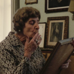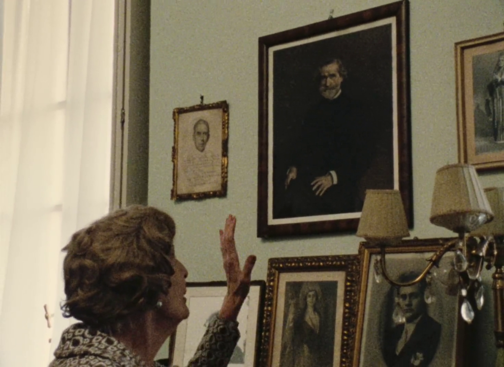 Mas — há sobre a Casa, como disse, outro “beijo de Tosca”, ou o pequeno beijo de uma outra Tosca: o de Sara Scuderi, a grande “estrela” deste filme. É o beijo que a Scuderi envia amorosamente, com a ponta do indicador, ao retrato de Verdi, o maior entre os retratos que nos apresenta no seu quarto — um beijo para esse músico por quem tem “um fraquinho”, uma “ternura especial”, de quem “gosta como se fosse da sua família”, que até parece sorrir-lhe de volta no retrato; o seu “tão querido Verdi, que Deus o abençoe por todo o bem que nos fez”.