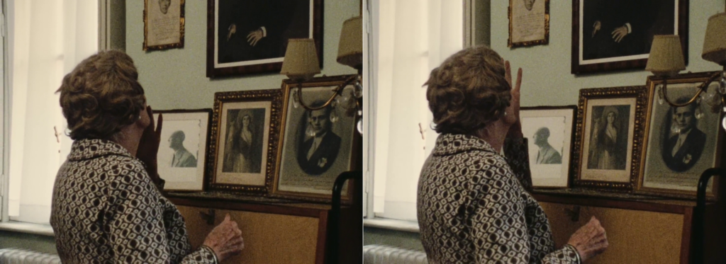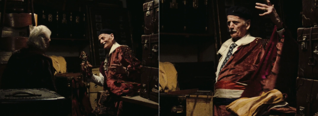 Antes de ir a este pequeno beijo, vou, porém, a outro ainda — um que me escapou quando vi pela primeira vez o filme, um gesto mínimo, não de Tosca, não da Scuderi, mas de outro dos residentes da Casa: o velho barítono Giuseppe Manacchini. Estamos no fim de uma das cenas mais belas, também mais melancólicas, do filme. Manacchini e a sua mulher, a velha soprano Della Benning, visitam uma cave para abrirem, presume-se que pela primeira vez em muito tempo, o malão onde estão guardados os fatos de várias das personagens em tempos interpretadas pelo cantor, nos quais ele “tanto suou”. Ali temos um Barnaba, temos um Germont, temos um Figaro — perdão!, o fato vem com uma corcunda: afinal é um Rigoletto, “santo Dio!” — Manacchini desculpa-se, é da comoção. O cantor volta a experimentá-los um a um, a vesti-las, as personagens, uma a uma diante da mulher.