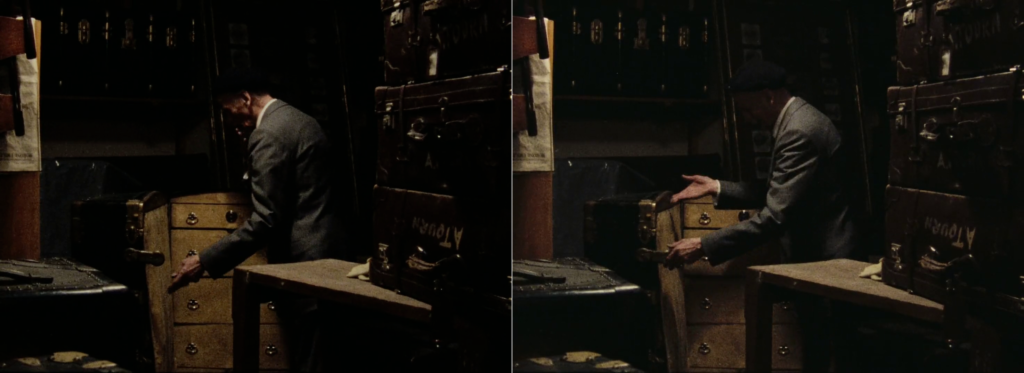 A mulher sai, entretanto (não a vemos sair), e deixa-o só. Chegamos ao fim da cena — desta cena do filme que descrevo e da sequência de pequenas revisitações ali encenada. A cave é agora mais escura. O cantor, de novo com o seu fato sóbrio de Manacchini e com uma expressão de grande melancolia (que notaremos melhor quando, à saída, ele olhar ansiosamente para trás uma última vez, vacilando um momento nessa direcção), arruma as gavetas da grande mala. Aí, antes mesmo de a fechar, num segundo só, o velho barítono lança-lhe para dentro um beijo com a ponta dos dedos.
