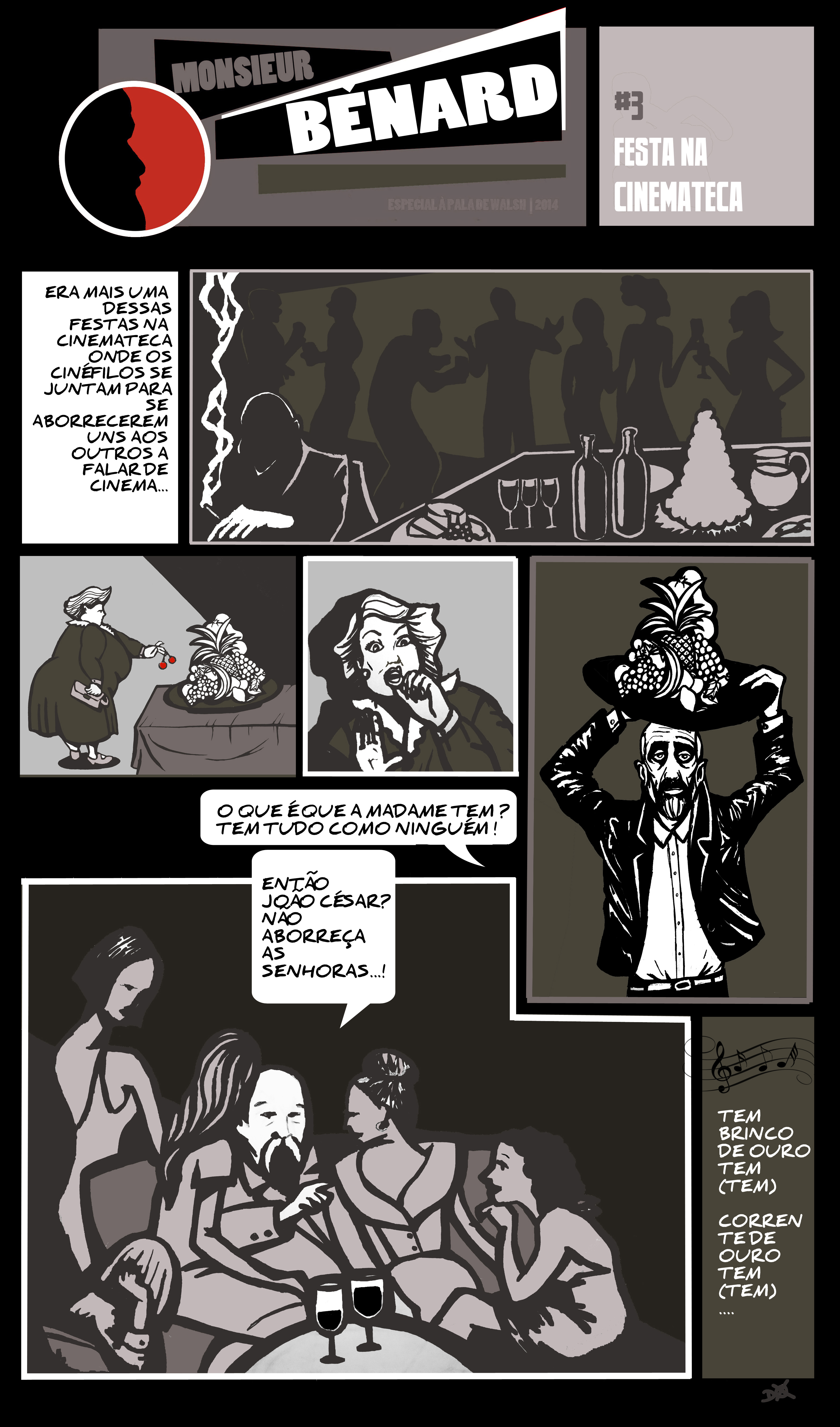 Queríamos que, nesta homenagem a João Bénard da Costa, coubesse mais do que apenas “o homem do cinema”. Lançámos o desafio a Manuel S. Fonseca, ex-programador na Cinemateca Portuguesa e actual cronista do suplemento Actual do Expresso, também nosso convidado nas próximas Conversas à Pala, e a Dox, artista em estreia na banda desenhada, para falarem de “o cinema do homem”, isto é, das imagens, quase sempre burlescas, que fazem de Bénard uma pessoa singular, por vezes pitoresca como um Tati ou Chaplin, e, acima de tudo, um amador exemplar: pelo cinema, sim, mas também, ou antes de tudo, pelas pessoas que partilham, de algum modo, o prazer tantas vezes incomunicável, de cumplicidades profundas (dizem que patológicas!), da cinefilia. Manuel S. Fonseca usou da caneta para pôr em texto algumas das estórias mais deliciosas protagonizadas por Bénard da Costa, trazendo para o domínio público aquilo que, até hoje, apenas alimentava, com altíssimas doses de boa disposição, uma reverência imensa e muita saudade, a memória do ex-director da Cinemateca nessa casa que ainda é a sua. Dox usou do desenho para alimentar a lenda, porque diz a boa lição fordiana que “quando a lenda se torna facto, imprima-se a lenda”. Pois bem, a imaginação é o limite nestas bandas desenhadas protagonizadas por Monsieur Bénard. O petit théâtre bénardiano está montado e este só foi possível graças à colaboração incondicional dada pela família da Cinemateca Portuguesa – Museu do Cinema, aquela a quem nós, filhos de Bénard, queremos dedicar este trabalho. Naturalmente, agradecemos ainda a Manuel S. Fonseca e a Dox por terem aceitado – e com o sucesso que pode confirmar abaixo – este nosso desafio. (Luís Mendonça)