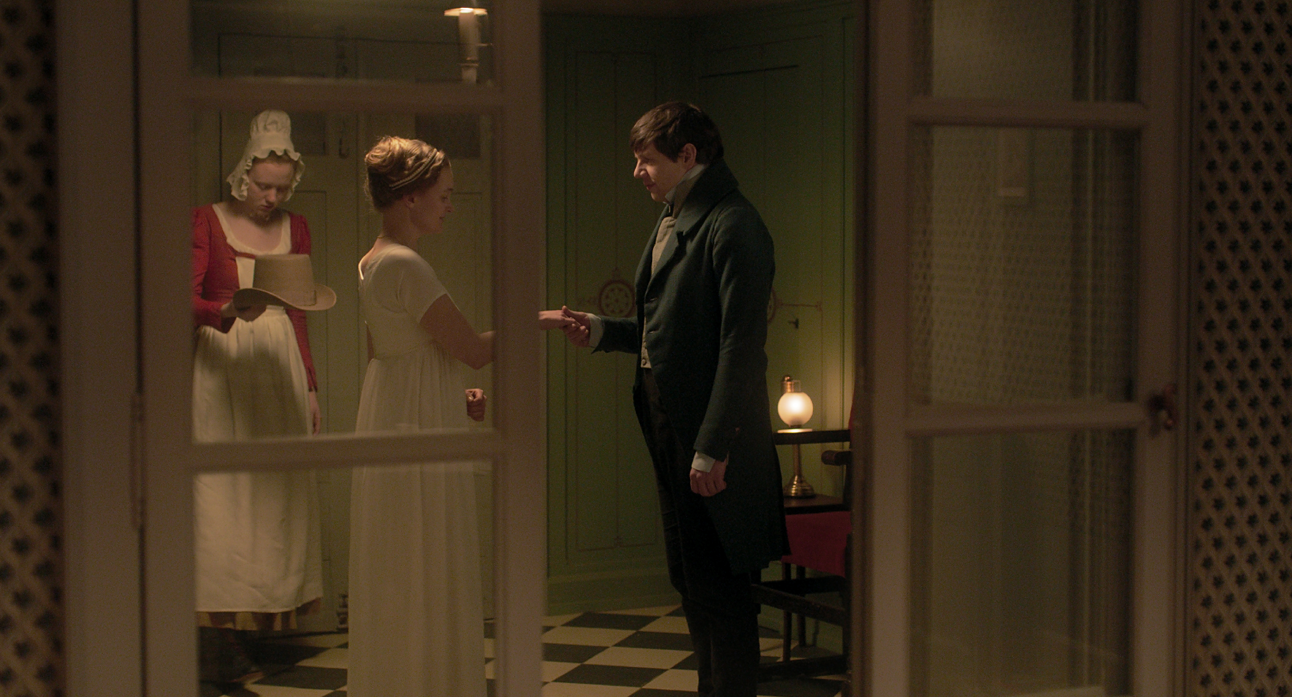 Mas não é apenas deste acto consumado, deste encaixe melancólico de duas peças, que se faz Amour Fou (mantenho a permanente negação do “apenas” para que me acompanhem na descoberta) – como dois seres já mortos antes da morte, Kleist e Henriette vagueiam, à laia de fantasmas, entre a alta aristocracia prussiana, que discute pontualmente, em soirées e chás, o pagamento de novos impostos, o receio da difusão dos ideais da Revolução Francesa, as questões da igualdade… O contraste é deveras simples e evidente: o discurso da morte traz a oferta de uma liberdade transcendente face ao agrilhoamento do avanço da história política europeia, ou se quisermos, dessa “estranha instituição que é este mundo”, como dizia Kleist. E agora sim, não podemos deixar de referir aqui a plasticidade do cenário, a sua rigidez compósita, a luminosidade gelada das paredes, de dia (que à noite se torna camarária) – espelhando uma certa petrificação aristocrática –, e da evocação pictórica, que tem algo de Vermeer, sobretudo na imagem da mulher a escrever cartas ou a tocar piano, embora se incluam animais e ramos de flores, a tirar um pouco de seriedade ao modelo, e instalando o máximo artificialismo. Os lugares comuns que, nas tais soirées, se proferem em benefício do assentimento geral dos presentes, são, assim, tão bem arrumados como as gavetas da casa. A desordem nasce, invisível, do desejo de uma liberdade superior, bem agreste às preocupações de classe.