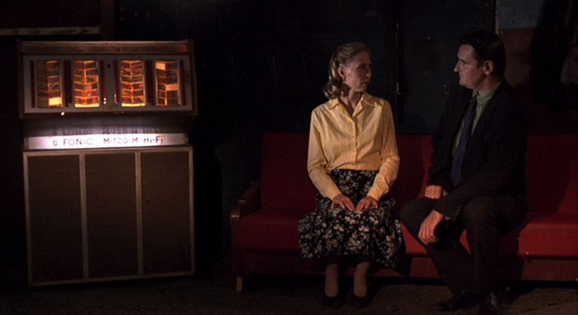 Revela-se um exercício muito ingrato ter de escolher apenas um plano, se o cinema de Aki Kaurismäki se presta a tantas e expressivas oportunidades de encontrar uma jukebox em plena orgânica de encenação. Não será um objeto que apenas actua como figura, mas sim um elemento de escrita. Lembremos Hamlet liikemaailmassa (Hamlet Vai à Luta, 1987) ou Tulitikkutehtaan tyttö (A Rapariga da Fábrica de Fósforos, 1990) onde, por exemplo nesse último, Kati Outinen – a actriz de Kaurismaki que vemos também neste plano – surge um par de vezes acompanhada de uma jukebox, a fazer um luto pessoal, estático, através da música (Tchaikovsky) que provém da máquina. Aliás, dir-se-ia mesmo que música e cigarros são duas marcas bastante notórias e repetitivas… “Vamos sentar-nos no sofá e ouvir um pouco de música?”, pergunta um homem a uma mulher, como se o propósito fosse o de vermos o contraste entre a sua camisa amarela e o sofá vermelho. No entanto, ao enfrentarmos este plano de Mies vailla menneisyyttä (O Homem Sem Passado, 2002), é quase impossível não compreender imediatamente a tomada de posse visual da jukebox: ela opera na composição do quadro romântico (sim, Kaurismäki tem aqui as suas formas de romantismo bem activas), e a música, efectivamente, traduz-se numa força totalizante da própria cena, erradicando a necessidade de diálogo. A música é, assim, a única coisa que acontece e que estimula outra ocorrência: a posterior aproximação dos rostos. O que este plano guarda é ainda uma postura fotográfica, de antecipação ao gesto humano, onde a jukebox se insinua como fonte de alimentação. É dela que emana a luz e o som que não ouvimos – ou se calhar ouvimos.