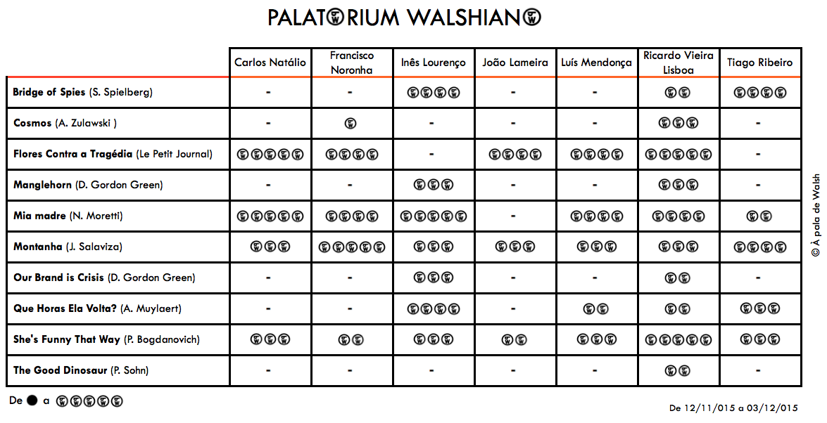 Destaques deste Palatorium: Mia madre (Minha Mãe, 2015) de Nanni Moretti e Montanha (2015) de João Salaviza. Dois filmes praticamente consensuais entre este grupo de walshianos. Outra das estreias do momento, Bridge of Spies (A Ponte dos Espiões, 2015), também merece notas altas da parte dos nossos críticos. Um caso pouco habitual: David Gordon Green conta com dois filmes estreados recentemente nas salas portuguesas. E nenhum embaraça. Apesar de Moretti, nada comoveu mais por estes dias que as palavras trocadas entre pai e filho sobre o poder das flores contra o mal das armas, uma das homenagens mais bonitas às vítimas dos atentados de Paris. Houve até um walshiano que, rompendo com as regras do Palatorium, lhes quis dar seis palas.