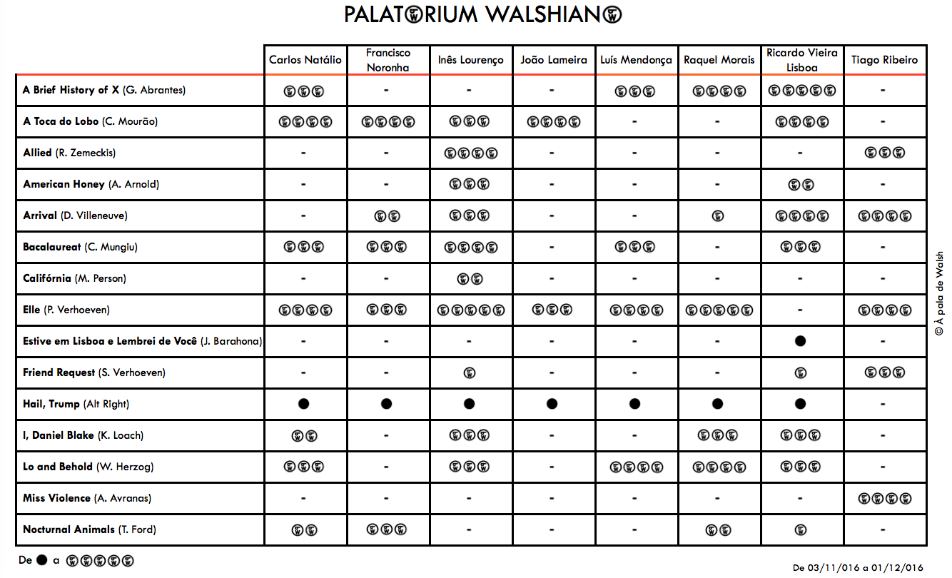 O destaque maior vai para o regresso de Paul Verhoeven e a composição gélida – gelidamente sexy – de Isabelle Huppert: Elle (2016) é um dos filmes consensuais da temporada. Outra sessão a não perder: a que junta Gabriel Abrantes e Werner Herzog, com A Brief History of X (2016) e Lo and Behold, Reveries of the Connected World (Eis o Admirável Mundo em Rede, 2016) – um double bill imperdível. As opiniões dividem-se em relação à ficção científica metafísica de Denis Villeneuve. O entusiasmo pela Palma de Ouro de Ken Loach é contido, ainda que a nota seja positiva. Bacalaureat (O Exame, 2016) de Mungiu tem uma performance sólida no nosso Palatorium. Allied (Aliados, 2016), o novo de Robert Zemeckis, ganha adeptos entre os walshianos. Por fim, somos implacáveis com os “Hail, Trumps” da autoria de um ajuntamento de extrema-direita. O que é que 2017 nos reserva?