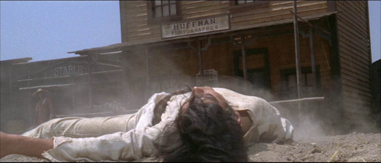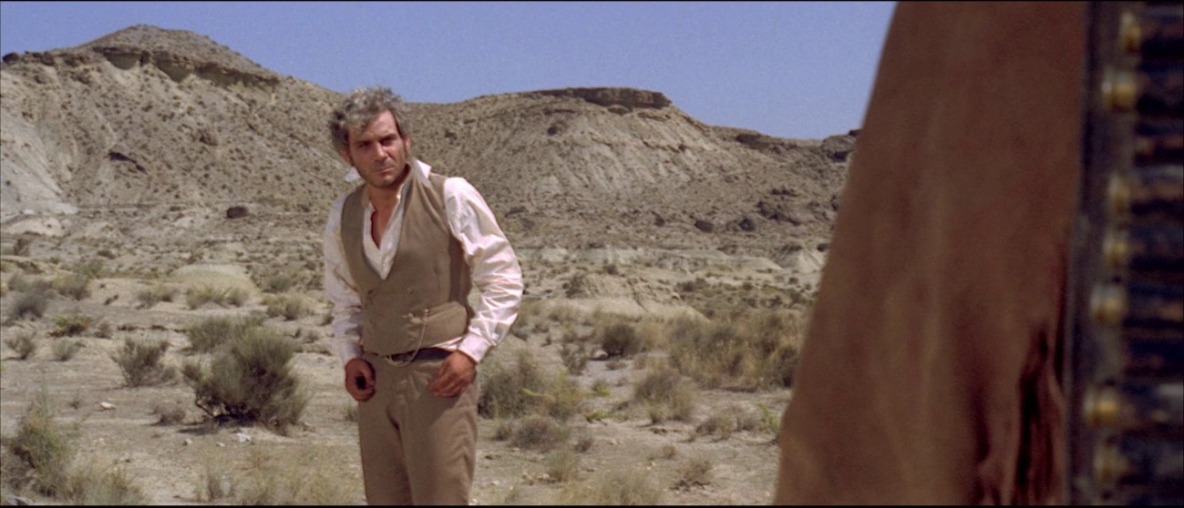 A cena seguinte é, não mais cerimonial-hagiográfica, mas citadina e “casual’; porém, será? Volonté está esperando a diligência local, lenço à cabeça e iminência da exaustão; ele discorre como um dandy exilado, mas é Milian, aprisionado e teso de raiva na carroça, quem vai trazer a mediação decisiva para a cena do deserto: expedito, saca do revólver e sequestra Volonté para o carro. A partir daí, “devemos ler” que Sollima mobiliza um certo inconsciente deontológico da tradição spaghetti, filhos em Leone anedóticos e devedores de clins d’oeil facilmente paródicos; mas aqui finos ironistas sages: é contrapondo nos extremos do scope as duas figuras, agora inegavelmente arquetípicas, ou segundo a oposição plongée e contre-plongée, que Solima, servindo-se do plano como révelateur da força, vai nos dizer que são antes de tudo figuras opostas e complementares e, como veremos, portanto intercambiáveis.