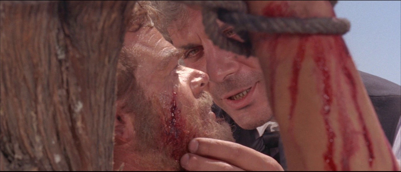 Mas é na cena seguinte, onde “sacrifica” um opositor, que Volonté vai nos dar uma repetição decisiva para afirmar seu poder total, pois não apenas devedora da ruse política, e sim da escatologia bíblica. É uma lição para a comunidade reconciliada a forceps pela morte do opositor, mas também uma figuração hagiográfica do necessário sacrifício que se pode solicitar do povo em momentos de crise; o homem é amarrado em cruz contra a madeira – e preciso dizer de que supliciado se efectiva a repetição aqui?-, e Volonté encarna agora Poncio Pilatos, governador de Judeia, político ruseiro por excelência, credor absoluto da Realpolitik do “E o que é a Verdade?” Mas a questão ontem metafísica e valorativa do procurador humano, decorridos tantos séculos (trabalho dialético da diferença histórica) decai ou revela enfim seu substrato político irredutível, que a palavra inspirada bíblica edulcorara; Volonté fala em razões de Estado, e de Bismarck a Hitler e agora Merkel sabemos do que ele nos fala. A coalescência plástica a que me referi se figura nesta distância variada do eixo da câmara, que ora nos dá o homem como centro da arena comunitária (planos esparsos dos espectadores, recitando a lição), ora estóico sob a tortura (sim, como o duque de Blanchis, Volonté nos oferece uma lição excelsamente espiritualizada, convertendo o corpo do supliciado numa Summa de humores-mediações); ora finalmente prestes a se converter pois, à mercê deste Pilatos agora untuoso e de palavra beatífica que talvez já antecipe – repetição agora prospectiva – Torquemada ao confessar um infiel, o infeliz aprende pelo esprit da palavra sussurrada de Volonté aquilo que a lettre de seu corpo machucado já sabia de cor.