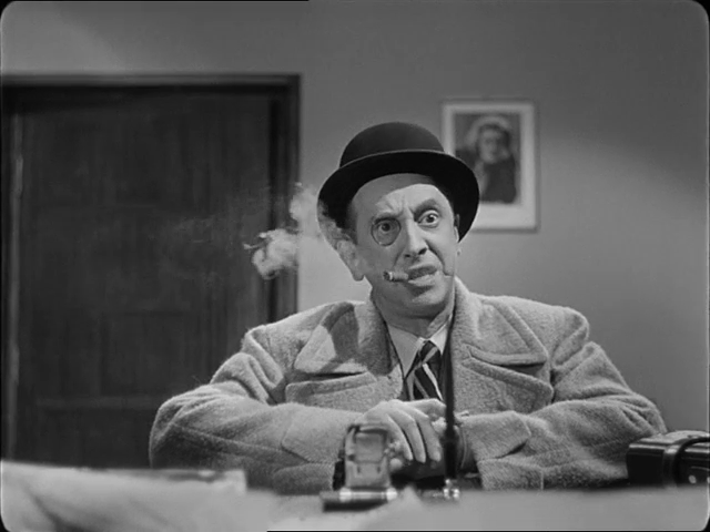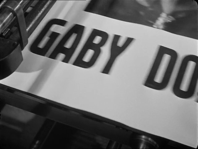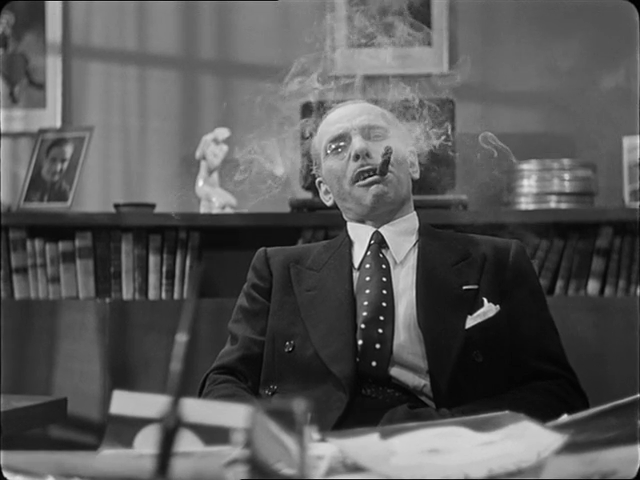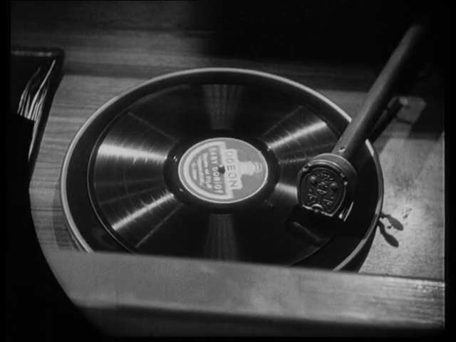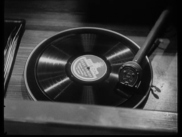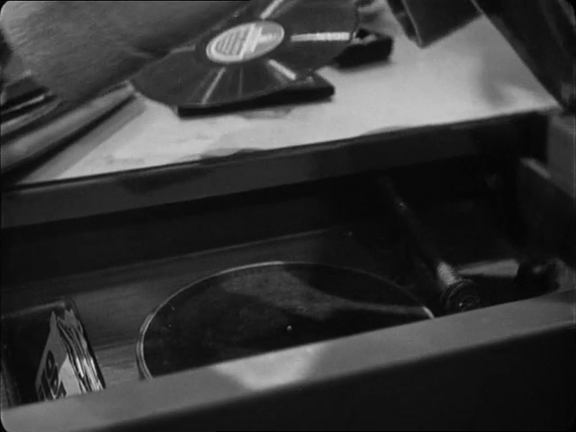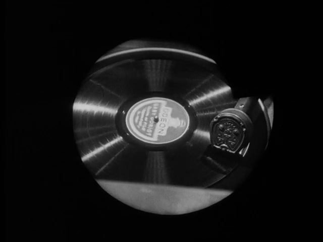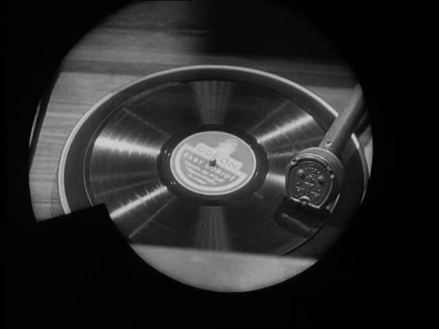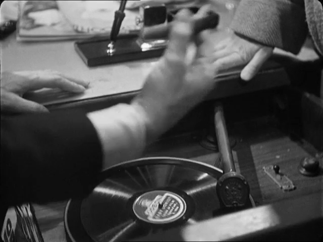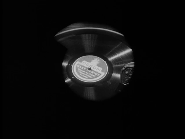 O efeito de fumo que se vê nos créditos transita para os primeiros planos do filme, em que dois homens conversam, enquanto fumam charuto (ao fundo, na primeira das imagens acima, vemos, desfocado, um retrato da protagonista). Trata-se de um agente e do director de uma produtora cinematográfica, que discutem o valor monetário de uma mulher, Gaby Doriot. O agente pede 450 mil liras pela produção de dois filmes com Doriot como actriz principal, e o director regateia para 400 mil liras. Descontente com o rumo da discussão, o agente tenta terminá-la, retirando o disco do gira-discos e preparando-se para abandonar a sala; o outro, porém, não desiste, tirando-lhe o disco das mãos e voltando a colocá-lo no gira-discos. A conversa é retomada. De forma significativa, encena-se aqui uma primeira figura da interrupção, do silêncio, da fixidez: ao retirar-se o disco do gira-discos, pára a música, interrompe-se a voz de Gaby Doriot (que é a condição acusmática da sua presença na cena) e termina-se a discussão que versa, lembro, sobre a própria Doriot. Isto é, nesta primeira cena, os vários elementos que se reportam à figura principal do filme são figuras do movimento: visual (o gira-discos), temporal (a música e a voz) e da ordem da linguagem (a conversa). Estes elementos são, note-se, interdependentes: o filme reitera que, concluindo a discussão, termina a música e guarda-se o disco. Garantir-se-ia assim a ausência de Doriot. E, no entanto, a cena termina com a segunda personagem a voltar a colocar o disco a tocar e a retomar a discussão, isto é, a criar as condições necessárias para que Gaby Doriot volte a ser uma presença. Todo o filme será construído de forma a fazer predominar o movimento, até ao último minuto, em que o fim do filme coincide com uma morte depois da qual – veremos porquê – não há possibilidade de continuação.