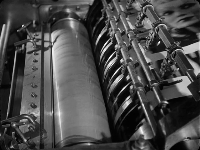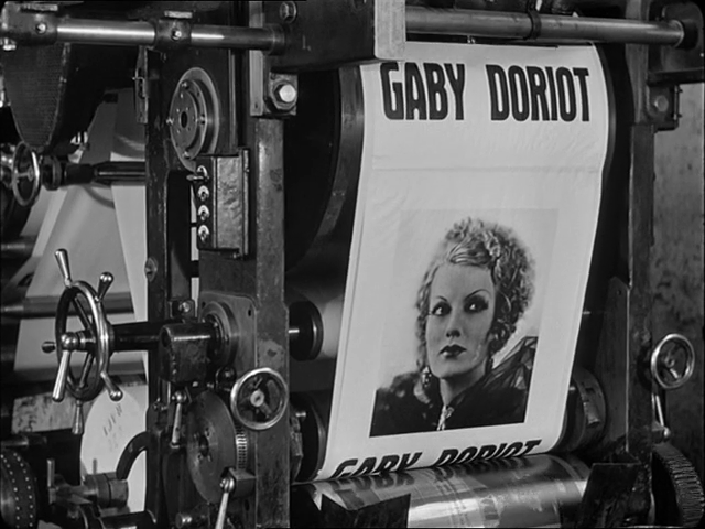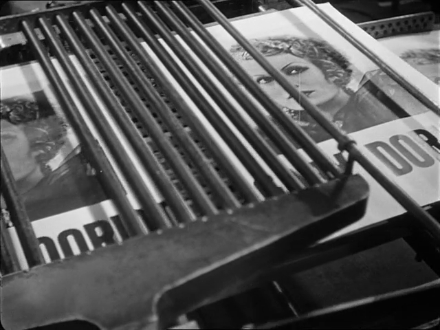 A cena seguinte sublinha esta mesma noção de movimento. Numa sucessão de planos, uma máquina imprime uma série de cartazes em que se vê a actriz Isa Miranda, lendo-se também o nome da sua personagem. Estes breves planos voltam a sublinhar que esta figura existe associada, por um lado, aos regimes da representação e da referencialidade (a imagem e o nome) e, por outro, ao movimento e ao ritmo (ela funcionará, veremos também adiante, como uma máquina de produção de imagens de cinema – o movimento circular do disco no início, aliás, replica também o movimento da bobine).