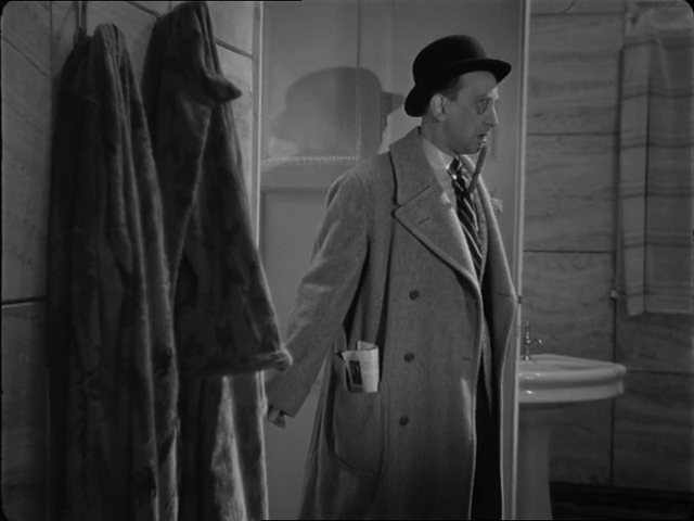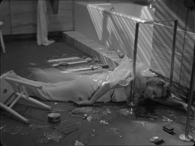 Do estúdio, passamos para o hotel de Gaby. O agente chama por ela, e, face à ausência de resposta, entra nos aposentos dela: primeiro na sala, depois no quarto, e percebendo finalmente que a mulher se encontra na última divisão, na casa de banho: “Ainda na casa de banho?”, diz, traduzindo a suspeita de que a actriz se demora na toilette, veiculando a sua vaidade (mais tarde, vê-la-emos várias vezes a olhar-se ao espelho). Não obtendo resposta, ele entra na casa de banho, pára na porta, surpreendido por um cenário que ainda não podemos ver, cai-lhe o cigarro da boca, e a câmara aproveita o embalo da queda para efectuar um movimento brusco que revela Gaby Doriot no chão, junto à banheira, entre vidros partidos. A câmara volta a pousar sobre o homem, e acompanha-o à medida que ele atravessa o quarto e a sala, refazendo o mesmo travelling que tinha realizado antes, no sentido oposto.