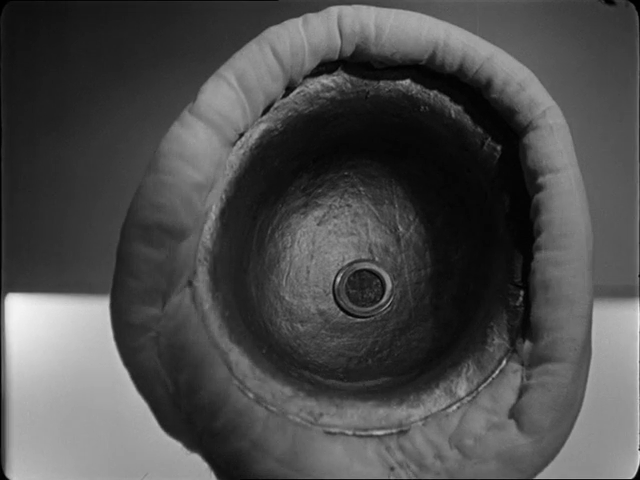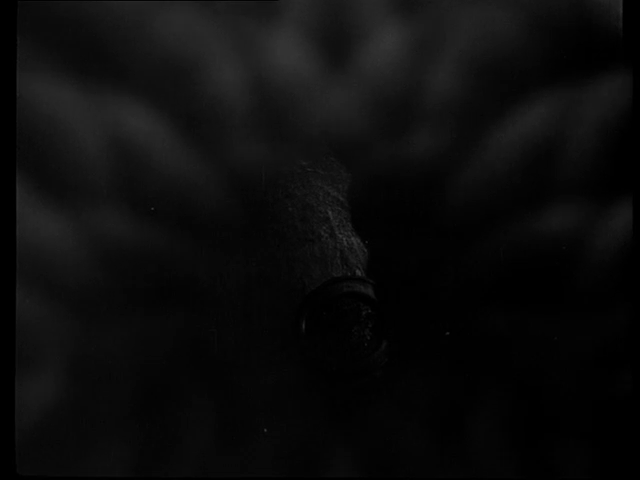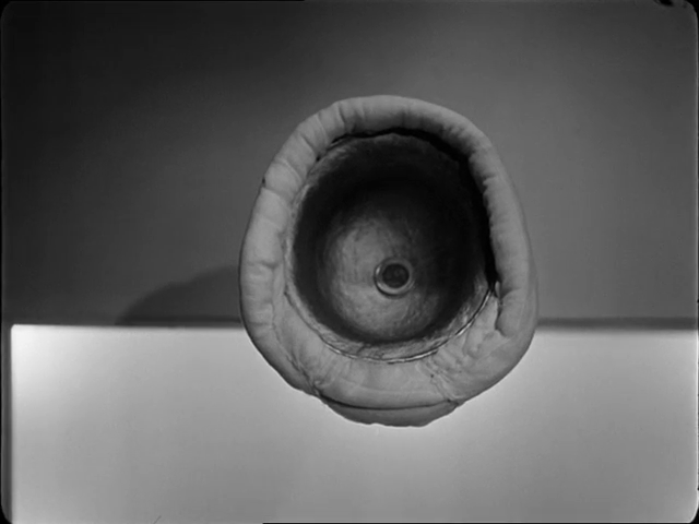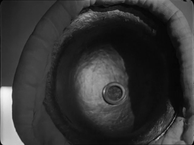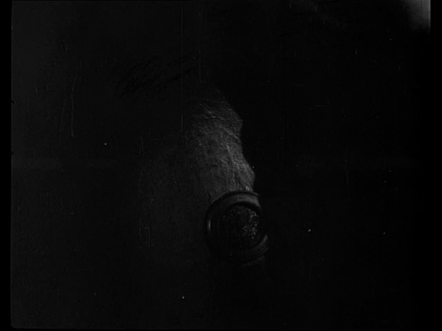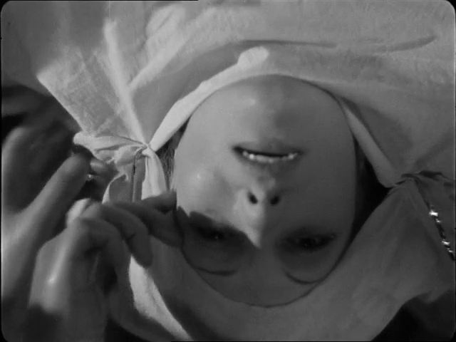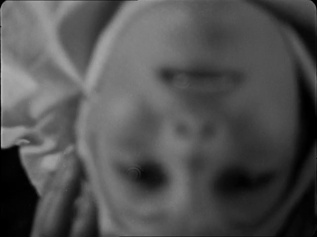 Um novo regime de imagem tem início no momento em que o filme assimila o ponto de vista da máscara de gás através de um plano subjectivo. Dar acesso ao olhar de uma figura inanimada – e que, portanto, à partida não vê (e, no entanto, fala-se no olho da câmara…) – anima-a efectivamente, e diz-nos, nesta espécie de prosopopeia visual, que a máscara de gás possui atributos da ordem do perceptivo. Do ponto de vista das implicações ao nível do estatuto da imagem, é evidente que este plano – o ponto de vista de uma máquina – inscreve no filme uma variação radical. No entanto, e a acrescer a isto, este estranho plano é complexificado a partir do momento em que se revela que ele é o campo de um contracampo (ou o contracampo de um campo) que corresponde ao olhar da mulher. Isto é, através da montagem, o olhar da máquina é posto numa relação dialéctica com o olhar da protagonista. A sucessão de planos subjectivos em campo/contracampo que atrás descrevi, e que se vê no conjunto de imagens acima, agudiza esta relação, sublinhando (agora sim, com uma certa dose de frenesim – mais do que um encontro pacífico, há um embate tenso) a aproximação física entre estas duas subjectividades, à medida que a máscara desce sobre o rosto da mulher.