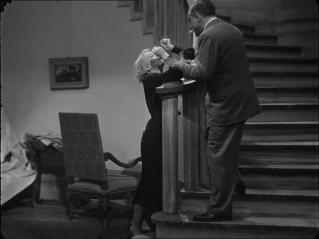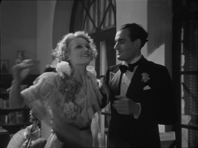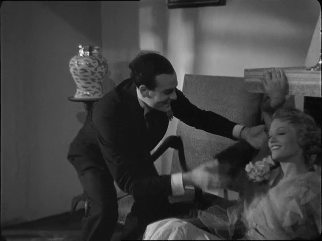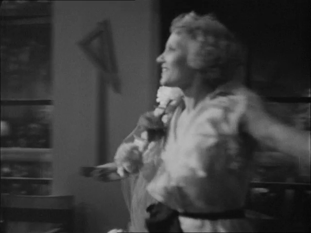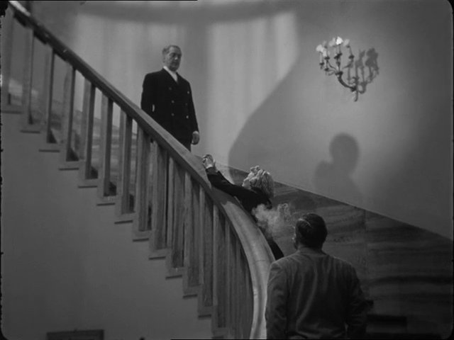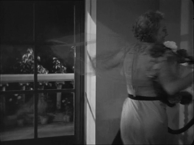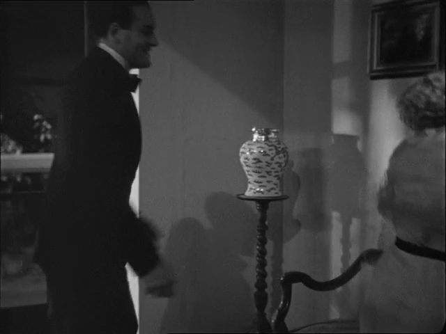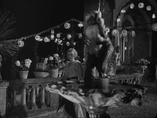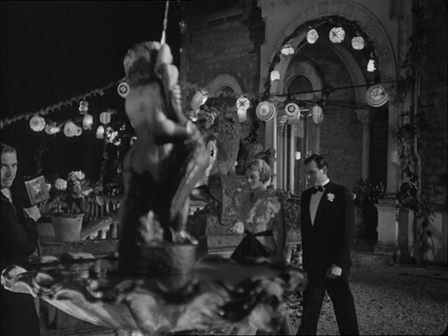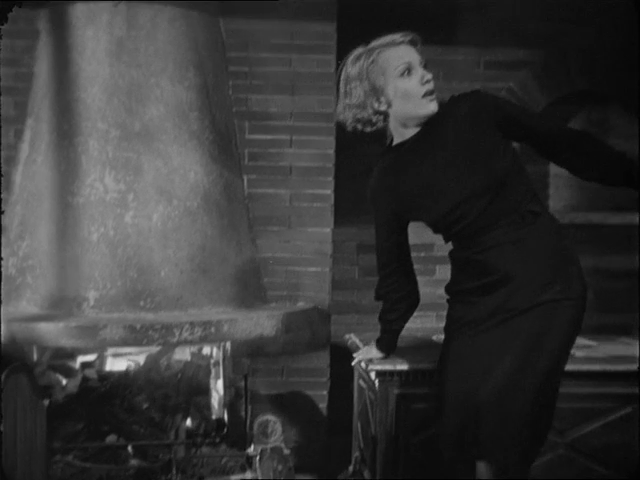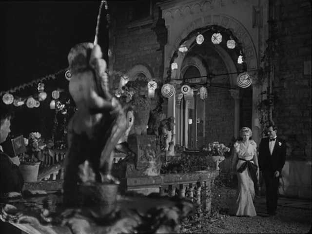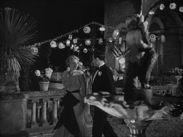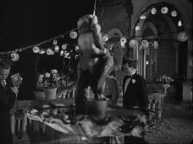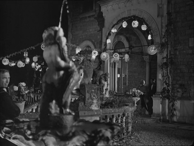 E, contudo, o espectador ouve efectivamente a música. Torna-se então evidente aquilo que, por este momento, talvez pudesse ter sido esquecido: o filme a que se assiste é o filme da cabeça da protagonista. Não admira, portanto, que ao assistir a esta cena na grande sala da casa, possamos ouvir a música que só ela ouve, e que, na realidade, não existe. Não é de forma arbitrária que Ophüls faz coincidir o início da música com um plano sobre o fumo, uma vez que foi o fumo que, como vimos, marcou a transição do primeiro nível de realidade para o sonho dela. Ao ouvirmos a música com ela, somos lembrados de que alucinamos com ela. Repare-se ainda nas últimas três imagens do conjunto imediatamente acima, e em como Ophüls compõe a imagem de modo que o fumo de cigarro projectado por Leonardo se misture com a cabeça de Gaby – a mesma na qual este filme, na verdade, acontece.