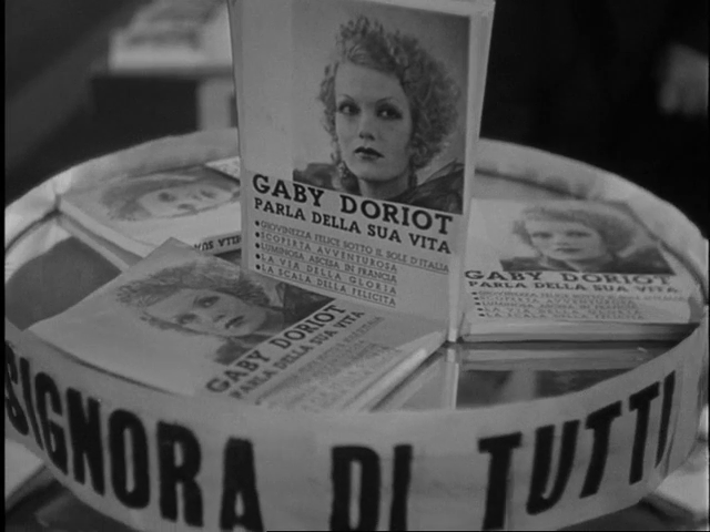 Em La signora di tutti, o círculo resulta muito concretamente da sobreposição de duas formas circulares: por um lado, o disco, que gira sobre si próprio, em sentido horário, e, por outro lado, o raccord, que revela a imagem num movimento de rotação centrífugo, em sentido anti-horário. Trata-se, então, de dois movimentos circulares que, funcionando numa lógica de oposição, e sobrepondo-se ao nível da imagem, geram na sua polaridade inerente um campo de tensão significativa. É possível ler o nome da protagonista, Gaby Doriot, na inscrição do disco, informando-nos de que a voz que se ouve na canção diegética corresponde à da protagonista, que canta nesse momento “Io sono la signora di tutti”. Ou seja, o filme começa com um plano aproximado de um disco, onde se lê o nome da protagonista, e que dá a ouvir uma canção, cantada por esta, em que ela declara “eu sou la signora di tutti”. Isto é, “eu sou [o filme]”, mas também, “eu sou [Gaby Doriot]”, o que por sua vez – dada a inscrição do nome no disco – pode significar “eu sou [o disco que toca]”. Em relação directa com o disco é posta também a própria imagem do filme, que abre literalmente sobre aquele objecto, ainda que num sentido oposto ao sentido segundo o qual ele gira.