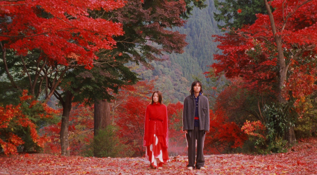 Mas, foi essa morte realmente justa? Pensamos que não. Até porque Dolls pode ser considerado, noutra leitura, como a obra em que o estilo particular de Kitano mais se universalizou ao ponto de se tornar transcendental – ou seja, um modo que acompanha tudo o que é, sem excepção. Foi isto que as flechas apontadas ao academismo formalista esqueceram, que há uma nostalgia de essencialidade no automatismo, que o seu esforço encerra uma depuração retorcida do real e não meramente uma simplificação ingénua. Não nos enganemos: este é um mundo de um só vislumbre, a despeito da tripartição narrativa e da pluralidade de personagens. Se qualquer juízo transcendental, portanto, está assente numa recondução do múltiplo ao uno, também Kitano teve de inventar variedade desinteressante, enfiar algodão nos espantalhos para melhor deduzir daí a metafísica que a todos anula. Afinal, trata-se de um exercício onde são os ningyô (marionetas) a olhar para os ningen (humanos), inversão da relação de poder existente no bunraku e que, no limite, restitui a tal compreensão de um mundo sensível e vivo subordinado à imobilidade passiva de um em que todas as regras estão já dadas.