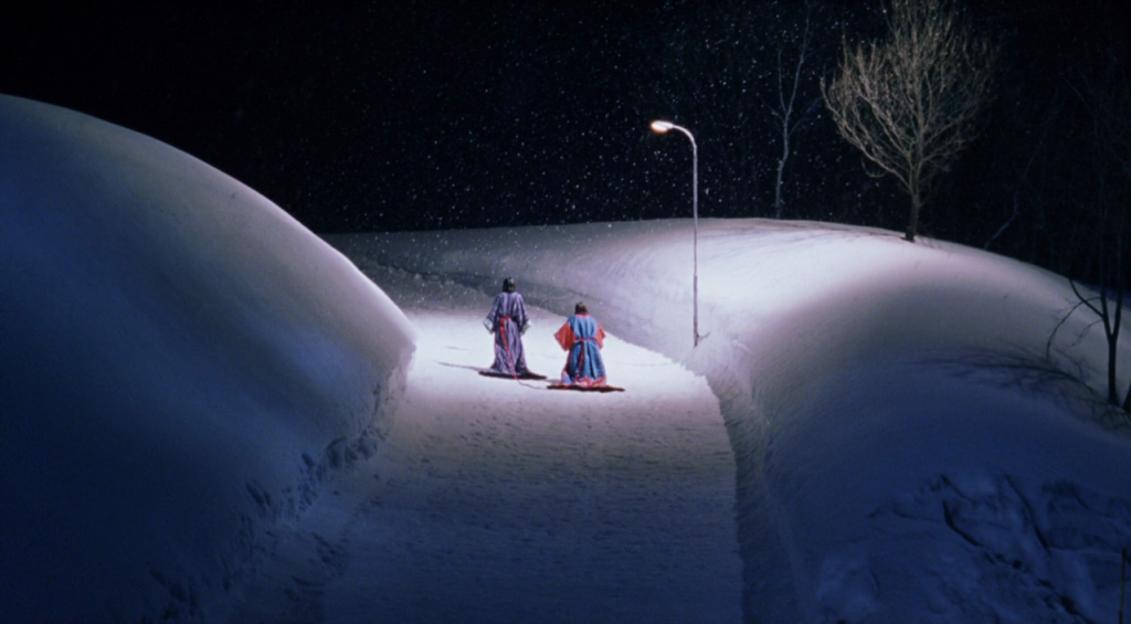 Regressemos à cena inicial, composta por travellings, cortes sucessivos na montagem, enfim, uma sensação de movimento tão rara em Kitano que não pode funcionar apenas como intróito ou menção exótica para impressionar espectadores ocidentais. A expressividade, quer da poesia do recitador (tayû), quer dos gestos (manipulados) das marionetas são também contrárias ao endurecimento das faces e fisionomias que povoarão o drama dos humanos imediatamente a seguir. Se é verdade que a estética do bunraku consiste em animar o inanimado, conferindo vida e realidade ao que, por natureza, não a possui, Kitano preferirá imobilizar o real, representando-o através de uma escassez ou mesmo esvaziamento de interioridade. Os ningyô de Chikamatsu têm mais alma do que os ningen de Kitano. A relação com o dispositivo teatral, contrariamente ao que muitos críticos escreveram, tão pouco é meramente ilustrativa nem reivindica grande fidelidade à fonte literária. A transposição dos périplos da humanidade feita ningyô do universo kitanesco não se efectua sem uma transfiguração, presente na assinatura do próprio realizador. Masahiro Shinoda, ao adaptar outro clássico de Chikamatsu, foi muito mais radical em Shinjû: Ten no amijima (Double Suicide, 1969) quando isolou os kuroko (figuras vestidas de negro que auxiliam o bom desempenho da peça) e tornou-os visíveis perante as câmaras, controlando os personagens humanos, alheios a tal furtiva presença, como se fossem determinados a agir de acordo com forças que os ultrapassam. Kitano pode não ter adoptado semelhante estratégia vanguardista de distanciamento, mas tão pouco resolveu reconstruir, com rigor histórico, o universo do dramaturgo como fez Kenji Mizoguchi em Chikamatsu monogatari (Os Amantes Crucificados, 1954) ou Tomu Uchida no parcialmente biográfico Naniwa no koi no monogatari (Chikamatsu’s Love in Osaka, 1959).