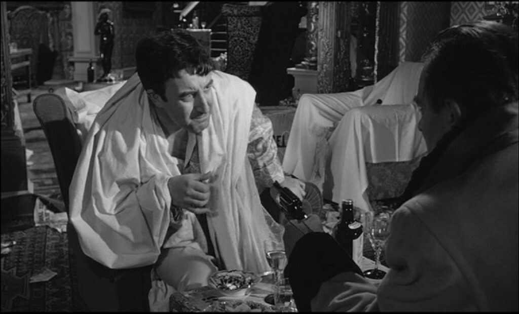 A primeira sequência do filme corresponde ao fecho do romance e da narrativa, no ajuste de contas entre Humbert, interpretado por James Mason, e o rival Quilty, que libertara Lolita. A presença de Peter Sellers como Quilty acentua a dimensão da personagem, de matizes entre o burlesco e o trágico. A imundície da residência de Quilty com garrafas e copos espalhados, como um fim de festa, é uma síntese dos comportamentos patológicos de Humbert, que obriga o rival a ler uma declaração, a assumir que se aproveitou de um pecado, da sua fraqueza. O filme vai explicitar nas diversas aparições de Sellers que Quilty é uma sombra do protagonista, a juntar um conjunto de obsessões sexuais sem freio. Uma versão ordinária que era necessário apagar, na procura do apaziguamento de Humbert.