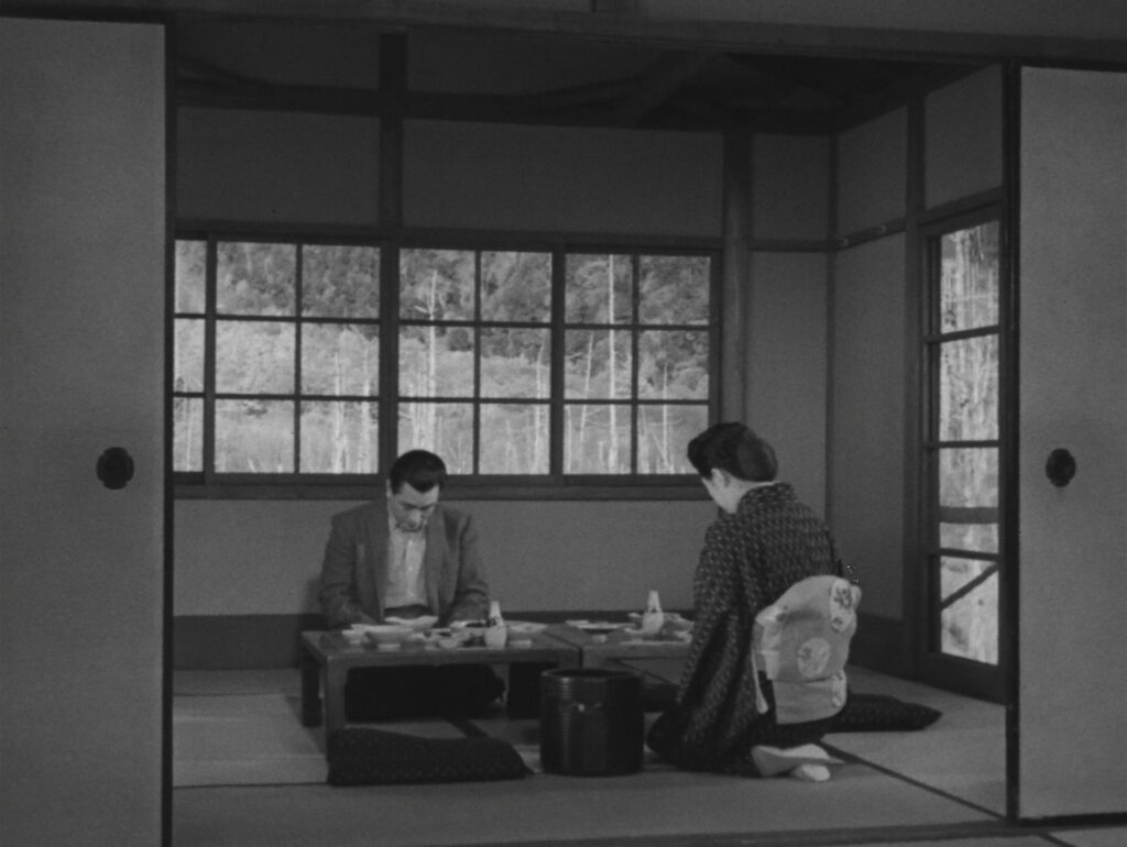 A cada repetição, a câmara de Shimizu recorda a monumentalidade da paisagem, com a opulência da floresta e a violência daqueles cumes rochosos, como quem coloca o humano na sua escala, com a pequenez dos seus dramas românticos. Porém, há uma sumptuosidade na sua maneira de filmar que parece olhar para a paisagem outonal com o mesmo maravilhamento com que filma um rosto triste. Talvez aí esteja aquilo que de mais belo se encontra em O Som do Nevoeiro, um pequeno (e sublime) filme sem diálogos composto por todos os momentos de silêncio onde, invariavelmente, se encontram copas de árvores ensombradas pelos picos montanhosos e rostos que trocam olhares mudos por entre tragos de saké. A intensidade desses grandes planos dos rostos de Ken Uehara (o professor Onuma) e Michiyo Kogure (a Tsuruko), onde já não há nada a dizer, onde resta apenas a contemplação resignada do outro, dizia eu, essa intensidade é o que de mais moderno se encontra na mise en scène clássica de Shimizu. Esses instantes de pausa são, eles mesmos, equinócios dentro do filme, sequências fotogramáticas de alinhamento geométrico onde contentamento e angústia se equilibram em perfeita proporção. E o que dizer da magistralidade de Shimizu no segundo equinócio (leia-se, no episódio de 1950) em que os corpos celestes do professor Onuma e da geisha Tsuruko se eclipsam constantemente num jogo de gato e rato cheio de azares e desoladoras coincidências? Dentro da repetição o acaso celeste, o eclipse como ilusão do destino.