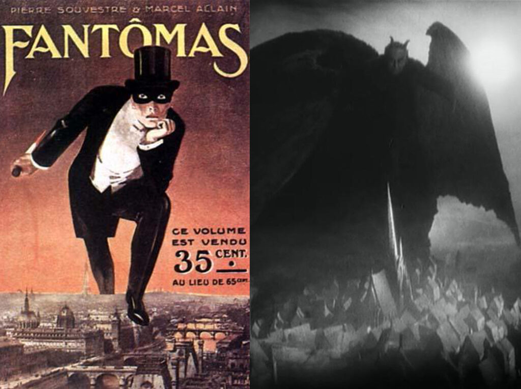 Se observarmos uma capa do livro Fantômas (1911), da autoria de Marcel Allain e Pierre Souvestre, em que Louis Feuillade se inspirou para a sua adaptação cinematográfica, com um fotograma de Faust (1926), o último filme de F.W. Murnau na Alemanha antes de se refugiar em Hollywood, ressaltam imediatamente as diferenças estilísticas. No entanto, no que diz respeito ao motivo, em ambos os casos uma figura gigante sobrepõe-se sobre a cidade: um demónio cobre-a com umas asas enormes, no caso de Faust; um homem com aspeto burguês pisa-a enquanto esconde uma adaga sangrenta, no caso de Fantômas, imagem que Feuillade adapta para os cartazes do seu folhetim. É apenas um exemplo, mas bastante claro, que ilustra que nem sempre as estratégias de representação da disseminação do mal nos filmes da República de Weimar estavam longe das utilizadas, anos antes, por Louis Feuillade. Outro exemplo inquietante da presença do mal no tecido urbano ocorre na cena final de um dos episódios de Les Vampires em que um “vampiro”, totalmente coberto pelo fato preto, caminha elegantemente pelos telhados de Paris. Enquanto a cidade repousa, desce pela parede de um dos prédios até à rua deserta, acrescentando um elemento surreal ao cenário de tons realistas, numa cena que não funciona como cliffhanger mas como sintoma de malaise du temps. O emprego de portas e túneis secretos, a infiltração no poder policial e judicial, a influência sobre o campo e a cidade, o domínio da rua e dos telhados, bem como as máscaras que alteraram a fisionomia e escondem a identidade são recursos associados à omnipresença do mal e, em larga medida, à sua inevitabilidade.