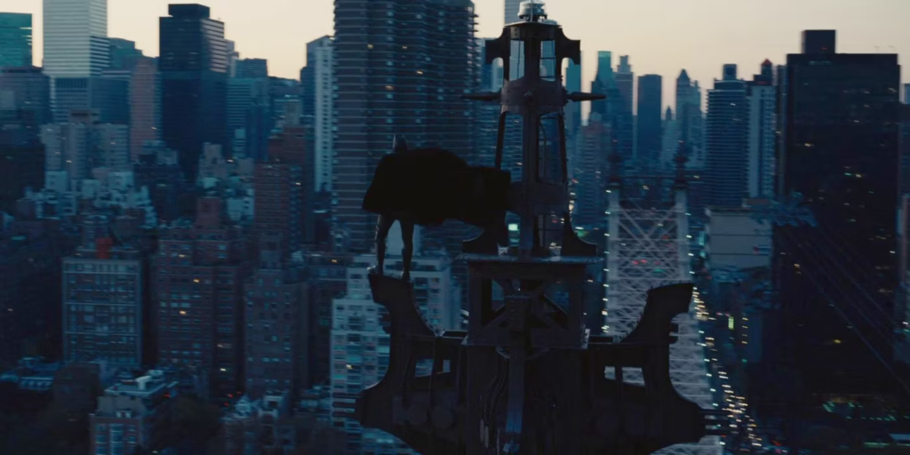Assim, o super-herói e seu inimigo, à semelhança das restantes personagens, falam constantemente da cidade, referindo-se a ela na terceira pessoa: “Gotham foi boa para a nossa família”, diz o pai de Bruce Wayne a seu filho em criança; “Quero salvar a cidade, mas, com a ajuda de Elektra, salvei-me a mim mesmo” (Daredevil). Encontramos, na banda desenhada, monólogos incessantes e por vezes amorosos entre o super-herói e a cidade: “Tu és linda, Nova Iorque… Adoro-te” [3]. A cidade torna-se o objeto de atração das personagens, tal como poderíamos encontrá-la nos films noirs, que mostram mafiosos contra polícias zelosos, lutando uns contra os outros pela mesma cidade que, um, afirma querer possuir e, o outro, defender. Desenvolve-se uma mitologia urbana que os filmes de super-heróis retomam: as personagens vivem no topo de edifícios, cujas portas envidraçadas têm vista sobre a cidade que lhes pertence [imagem recuperada da mise en scène da personagem Caid, em Daredevil (Demolidor – O Homem Sem Medo, 2003)], docas nas quais tomam lugar negócios ilícitos, ruas sombrias enfumaradas pelos vapores das aberturas de ventilação, reuniões de mafiosos que se matam uns aos outros [Elektra (2005), The Dark Knight (O Cavaleiro das Trevas, 2008)], cena fulcral em que o herói perde diante os seus olhos a sua família [Punisher (Punisher – O Vingador, 2004)], inspiração irrealizável de trocar a cidade pelo campo ou um subúrbio tranquilo, redentor [The Incredible Hulk (O Incrível Hulk, 2008), Elektra]. Na retoma deste conjunto de imagens e de temáticas da cidade noir (questões de vingança e de justiça), o filme de super-heróis apropria-se do género e altera as suas personagens: na cidade super-heróica tudo se pode tornar noir, inclusive os super-heróis [Spider-Man 3 (Homem-Aranha 3, 2007), The Dark Knight].