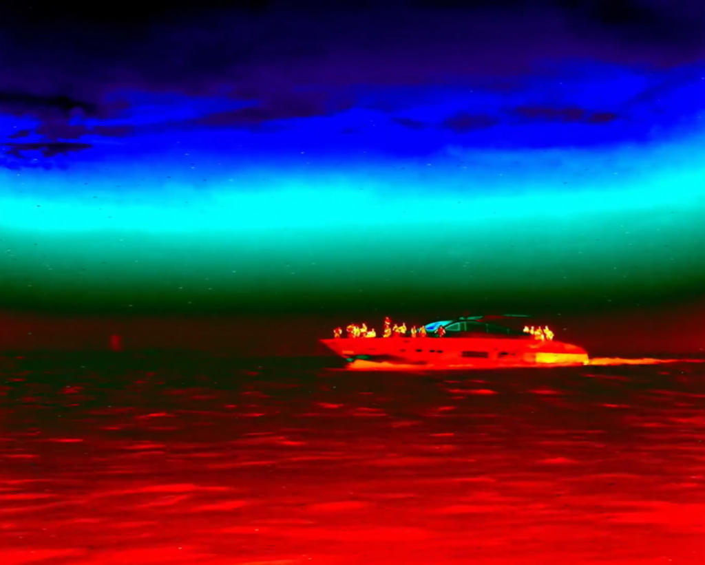 A deriva é precisamente essa droga que permite uma criação along the way, semi-automática que, ao mesmo tempo que quer ir queimando em lume brando a retina, também quer despedir-se do corpo. Pois trata-se de um abismo (ainda Nietzsche): as câmaras térmicas capturam um “outro lado” da vida, e do “outro lado” do corpo está a cibernética. Aproveito aqui para dizer que acho muito interessante essa pertinente referência ao Predator. E é pertinente, não apenas pela questão da visão térmica, mas também porque se trata de um filme que anuncia essa biotecnologia. Esse corpo em falência, com o futuro metálico escrito na sua profundidade.