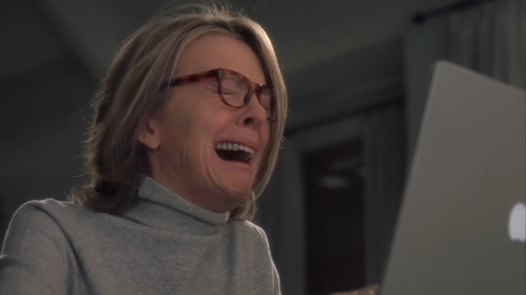 Quando o filme saiu em 2003, David Denby escreve na New Yorker que a personagem de Erica veste camisolas de gola alta e que a razão deve-se a “(…) uma declaração de moda anti-sex”. Apreciações similares surgem de amigos de Keaton a sua vida toda, incluindo de um ex-namorado, o cineasta Woody Allen, que antes de lhe entregar em mãos o seu AFI (Life Achievement Award) em 2017, mencionou que “Keaton veste-se para esconder a sua sexualidade”. Não há nada de rígido na mulher que se tornou um ícone de moda andrógino misturando o que seriam tidas, na altura, como peças de roupa exclusivamente masculinas com elementos objectivamente femininos, exponenciando o charme de uma actriz a florescer durante a visceral era dos seventies no cinema. Não havia como convencê-la a ser uma “actriz”. Ainda menos uma celebridade. Ela seria primeiro dela mesma. Quando Nicholson/Harry lhe pergunta porque é que usa camisolas de gola alta no meio do verão, a resposta não podia ser outra. “I’m just a turtleneck kind of gal”. Ali está ela. O mesmo volta a acontecer durante a afamada montagem de Erica a chorar laboriosamente, sequência que poderia pender para a paródia, mas que me faz pensar em tantas outras personagens interpretadas por Keaton, nomeadamente Annie Paradis, em The First Wives Club (O Clube das Divorciadas, 1996), que grita ao marido com a sua voz rouca e estridente: “I’M SORRY!” Corpo contido, focado naquela fúria que nem por um segundo considera não libertar. Ele andava a traí-la com a terapeuta dela! No estabelecimento de paralelos entre a vida real e a ficção, todas as suas personagens se revêem num magnetismo idiossincrático que é incapaz de se curvar ao conformismo.