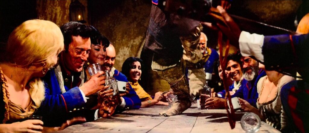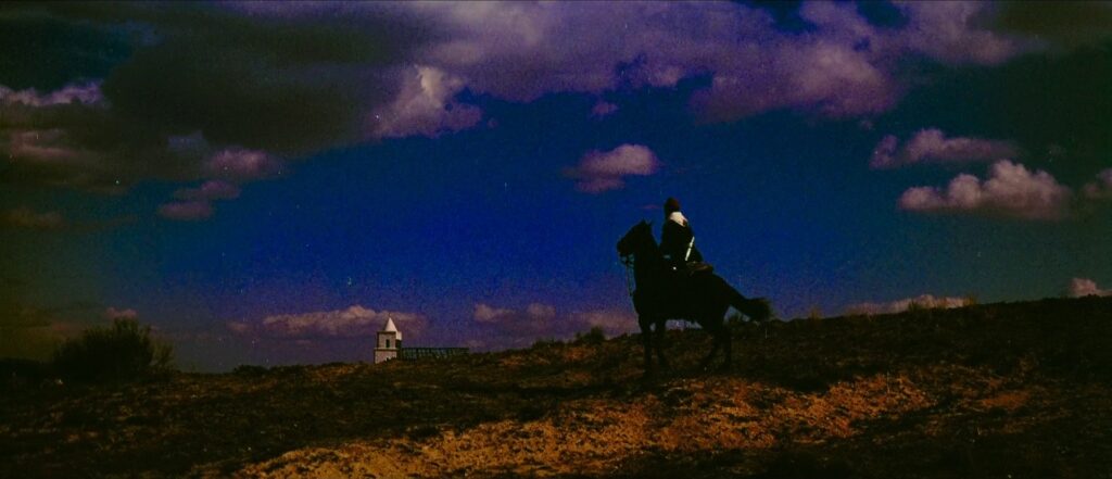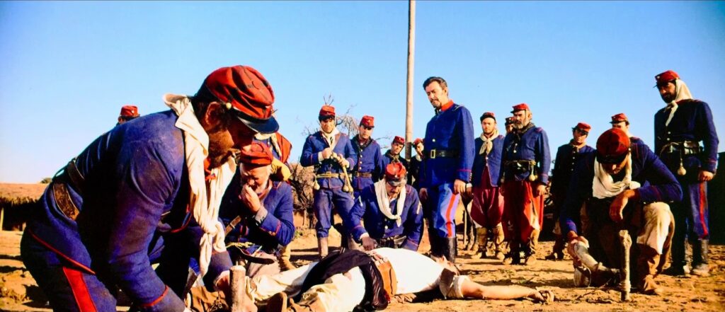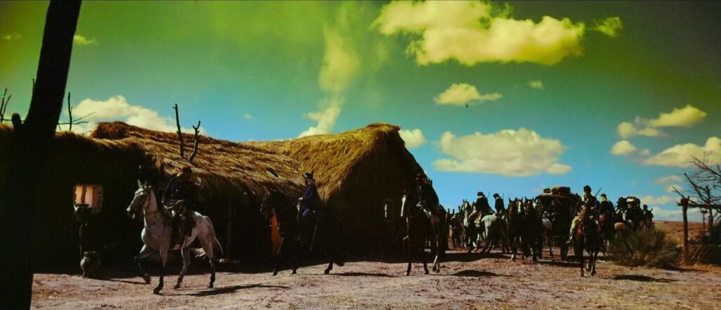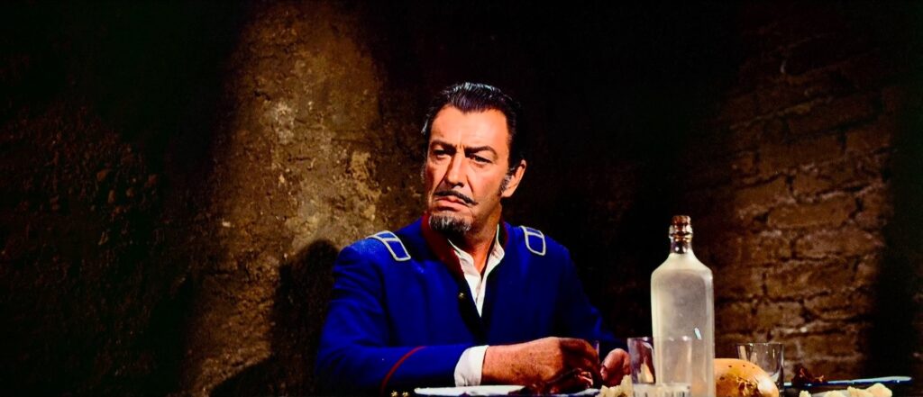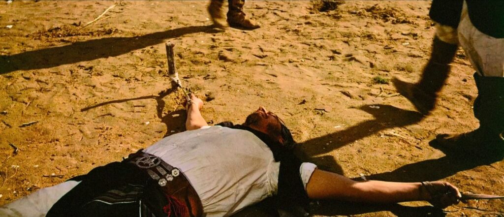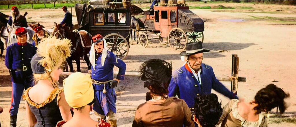 É preciso esperar quase dez minutos para encontrarmos a vedeta Robert Taylor. O seu personagem, um capitão do exército argentino, é descrito nessas primeiras imagens como um homem envelhecido, gasto e cansado. No primeiro corpo a corpo do capitão com um homem consideravelmente mais jovem, Taylor derrota-o e mata-o dentro de um cenário de cores berrantes, de uniformes azuis e vermelhos, com uma paisagem dominada por uma planície de ocres tangentes ao amarelo. Assistiremos várias vezes a esse pacto entre um corpo envelhecido (o actor tinha 55 anos) e um vigor alimentado por uma obsessão, por uma missão peculiar, dentro de uma extrema crueldade. Após o duelo, Taylor caminha de forma arrastada, insinuando que a réstia de energia resultava da acumulação de remorsos e de ódios passados.