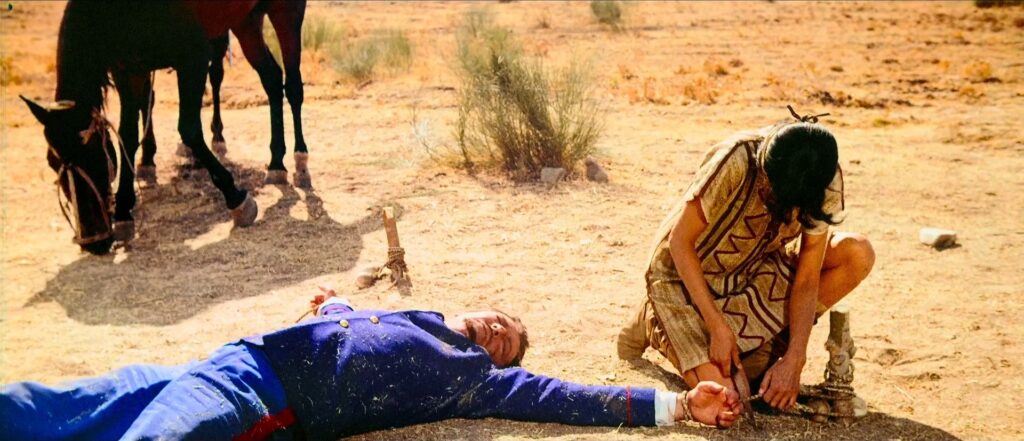 No dia seguinte, observaremos Taylor a negociar a mulher com o proprietário da hospedaria. Se o que vemos parece intuir uma situação de abuso do protagonista, de captura e colonização da indígena, mais tarde veremos que se desenvolveu outro tipo de relação entre os dois, um vínculo fundo e íntimo, que nos recorda a largura dos personagens de Robert Taylor, na desmontagem do seu aparente moralismo e na ligação com outras culturas, como a amizade com o pequeno japonês de Westward the Women. Será aquela mulher que o libertará das amarras, o salvará de ser consumido dos abutres, depois de Padrón o ter pregado ao chão do deserto. E numa espécie de coda da narrativa, a mulher ascenderá a testamentária do capitão, ao largar o seu cavalo, para percorrer veloz a vasta planície, numa tentativa tão isolada quanto poética de ensaiar, para lá da morte e da urgência do presente, a convivência futura entre os povos.