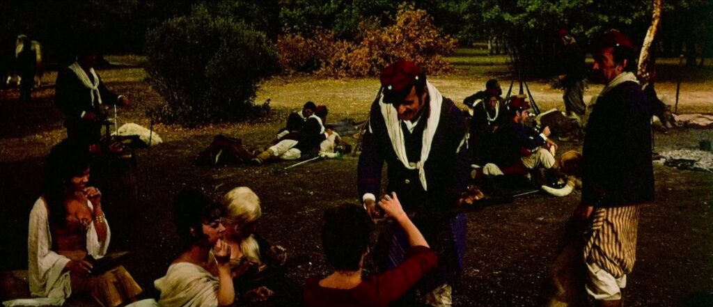 Quando Taylor avança sozinho para a aldeia para eliminar o chefe da tribo ameríndia, em mais um quadro notável, que satura as cores e a luz num vasto espaço nocturno, voltamos a notar a semelhança das fardas dos militares, em tudo idênticas às tonalidades dos ianques, aquando da guerra civil americana. Se o protagonista vence o contingente adversário numa acção solitária, a fazer render o resto do heroísmo do passado, é já uma acção demente, que apenas redimirá o velho capitão, pois o contexto não antecipa uma vida para lá daquele evento. Um acto heróico, então, como um sintoma de insanidade, de um personagem incapaz de existir ali, um personagem fora do seu tempo. O início da década de 1950, anos do pós-guera, de optimismo e do baby boom, em que se instalava a narrativa de Westward the Women, convidava a um horizonte assente na exaltação da expansão da América, apesar do início do desenho da caças às bruxas, imposto pelo Macarthismo. No contexto da produção de Savage Pampas, a América é outra coisa, são os anos de 1960 e de todas as convulsões, da exposição do racismo, de abusos e de preconceitos, alinhadas num vendaval de imagens, que incluiu a guerra televisionada do Vietname e os assassinatos traumáticos de Luther King e dos irmãos Kennedy.