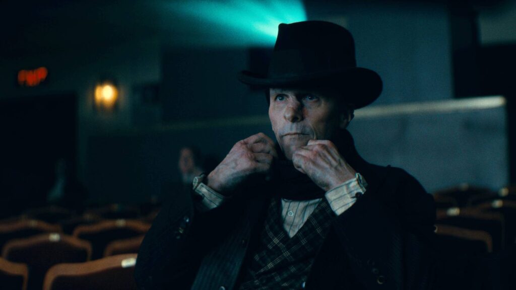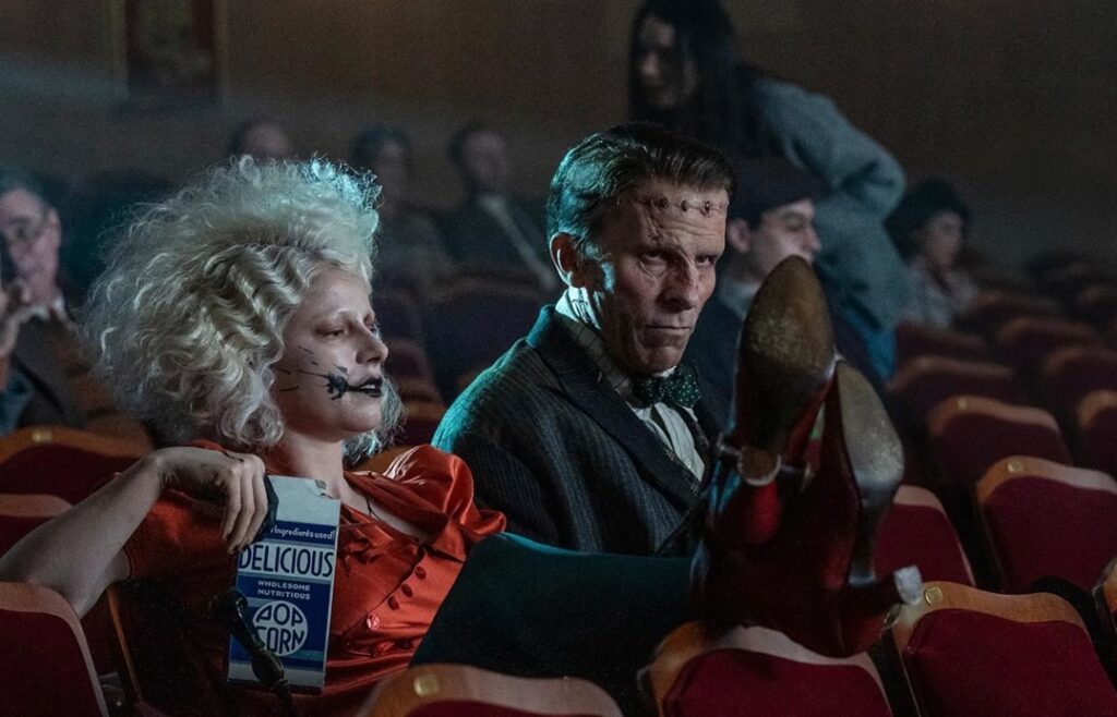 Num filme atravessado por notas desafinadas, as sequências em que The Bride! afina o tom são as de maior pendor auto-reflexivo. No meu texto sobre S1m0ne (2002), de Andrew Niccol, publicado aqui no À pala, explorei de que modo o cinema é, com frequência, conceptualizado enquanto medium frankensteiniano: um arranjo tecnológico que anima os mortos por meio de uma matéria retalhada – o próprio corpo dos filmes, produzido pela montagem. The Bride! inscreve-se explicitamente nesta tradição ao retratar o Monstro de Frankenstein, designado de Frank no filme, como um cinéfilo. A encarnação da cinefilia na figura da Criatura de Frankenstein sugere que esta paixão tem uma qualidade monstruosa. E esta monstruosidade cinéfila é especificamente frankensteiniana porque o espectador é animado pelas imagens projectadas.